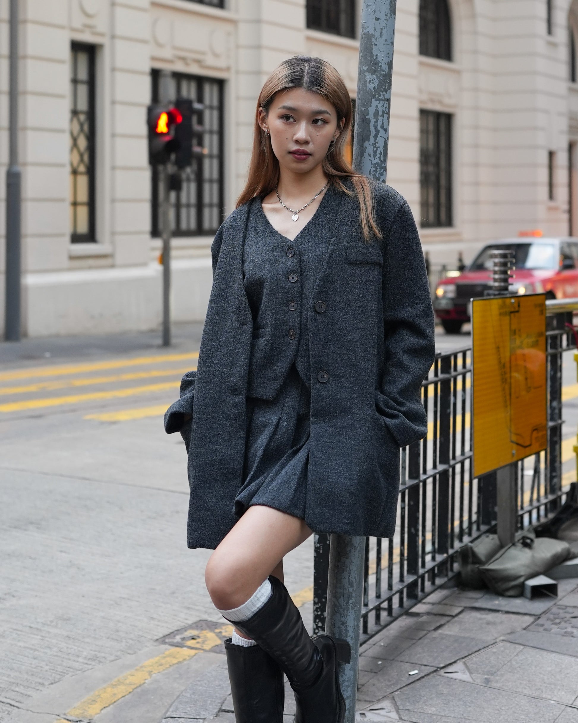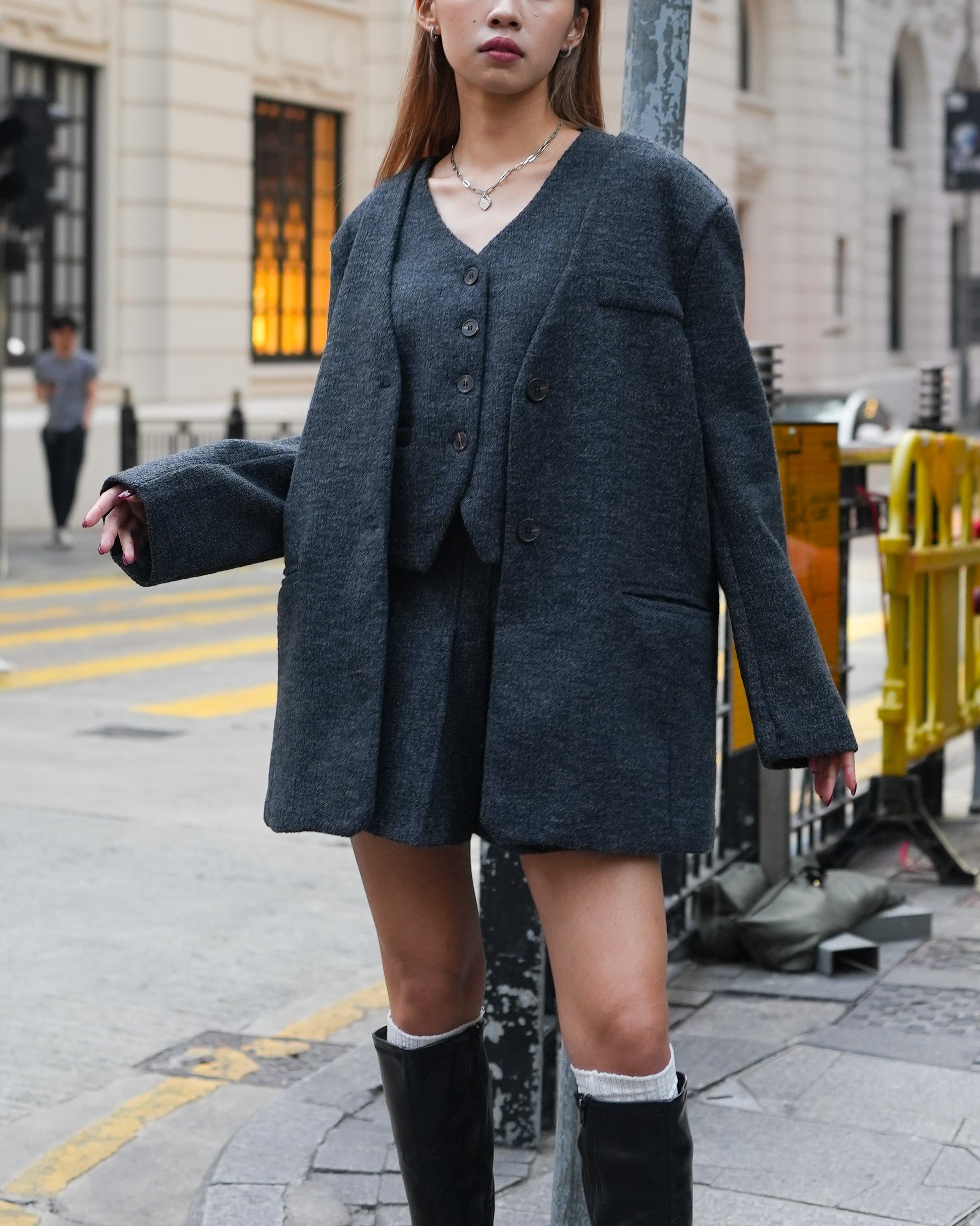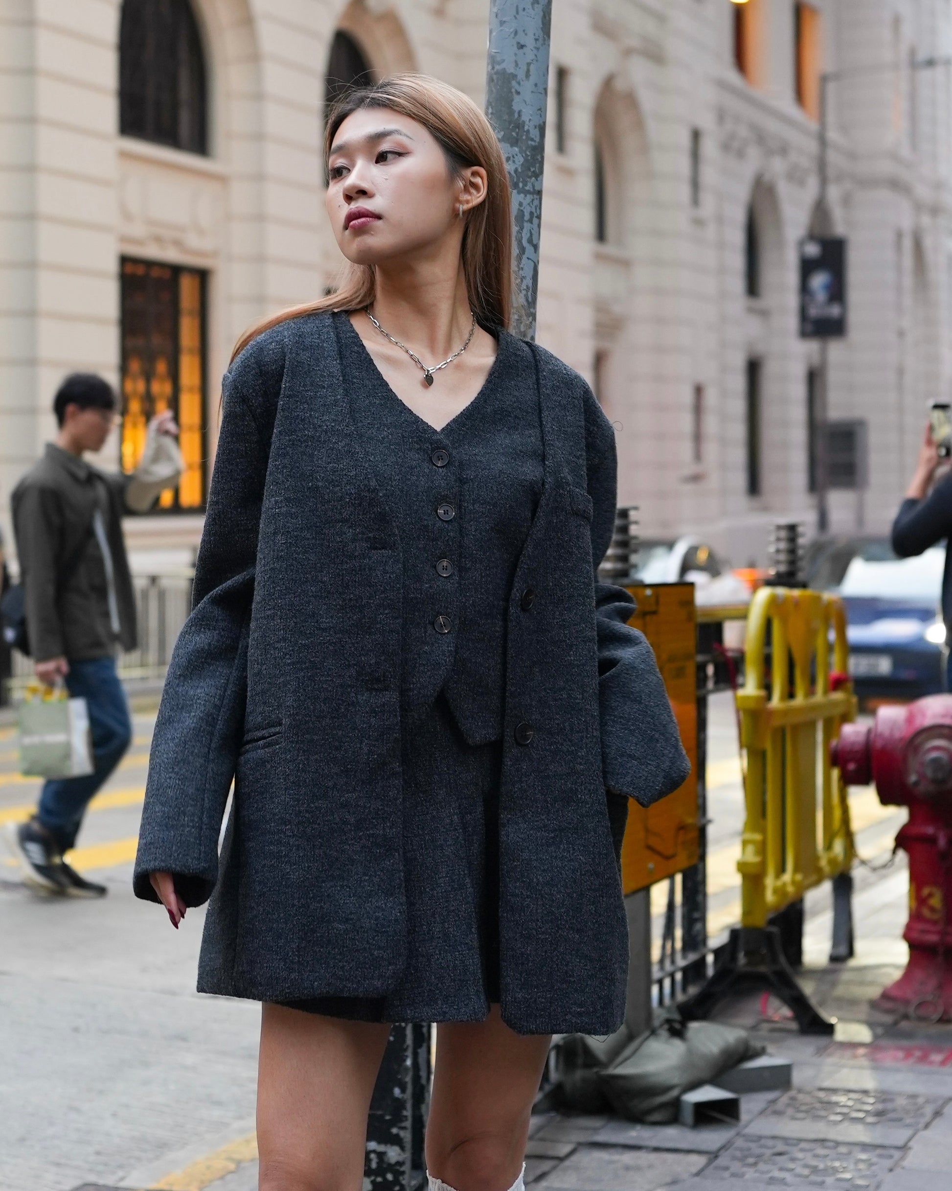 Free size ( Laid Flat Measurements ) BLAZER Chest S: 53cm || M: 55cm Shoulder S: 45cm || M: 47cm Hem S: 57cm || M: 59cm Sleeve length S: 60cm || M: 62cm Body length S: 75cm || M: 77cm VEST Chest S: 43cm || M: 45cm Body length S: 47cm || M: 49cm BOTTOM Waist S: 31cm || M: 33cm Total length S: 36cm || M: 38cm |